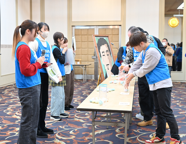 後半は、同委員会の学生が進行し、参加者に対して二酸化炭素(CO2)排出量が少ない行動を選ぶ2択クイズを10問出題しました。不正解の場合、二酸化炭素に見立てた紙製のボールをペットボトルの中に投入し、ボールの少なさを競いました。参加者は5グループに分かれ、クイズを楽しみながら脱炭素や温暖化対策について学びました。同委員会の新沼遼佳委員長(人文社会科学部2年)は「カーボンニュートラルの概念を可視化し、参加型のクイズを考えた。皆さんの反応も良く、出題を通じて自分たちも学ぶことができた」と笑顔で振り返りました。