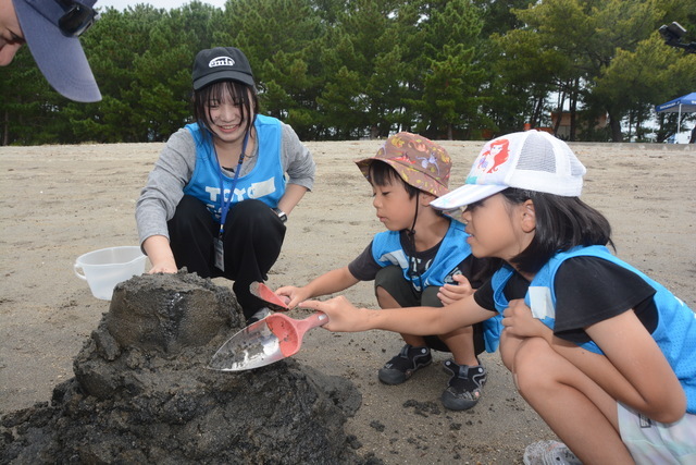 この日はNPO法人「くすの木自然館」の浜本麦さん指導のもと、砂山作り「掘って運んで積み上げろ!」やバケツに海水をくんで大きなバケツにいるアヒルの人形を救出する「バケツリレー」などに挑戦しました。子どもたちは持ち前のパワーを発揮。はね上げた泥が顔に付いたり、ぬかるみに足を取られたりしながらも、懸命に干潟を走り回りました。最後に漂流物などのごみを拾って回り、干潟の環境保全に一役買いました。最後に浜本さんは「遊びに来てくれた人たちが干潟や松林を大事にしてくれたから、今の重富海岸がある。皆さんもまた遊びに来て、重富海岸を大事にして」と呼びかけました。