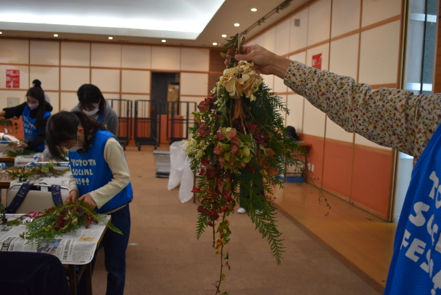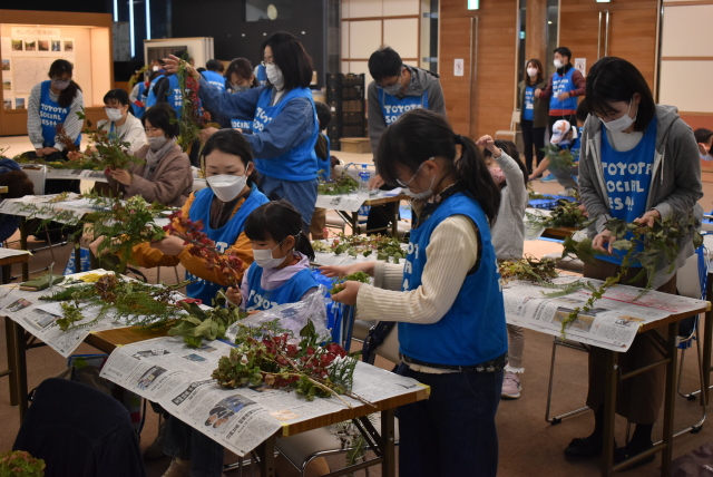 続いて第2部は事前に土佐山で採取した植物を使ってクリスマススワッグを作りました。講師はフラワーアレンジメント教室などを開催されている、SOU flowerの田井東結さん。現地の方は会場内に準備された数十種類の植物を、オンライン視聴の方は事前に送付したキットの植物を組み合わせて、各々オリジナルスワッグを制作。講師のアドバイスに耳を傾けながら、制作作業に集中する参加者の皆さん。試行錯誤しながらも完成にこぎつけた参加者からは「沢山の植物で色鮮やかなスワッグが作れてうれしい」と満面の笑み。友達連れ、ご家族連れ、画面越し、皆それぞれが〝土佐山の恵み〟を使ったクラフトを存分に楽しみました。