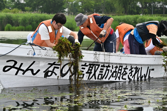 諏訪湖では8隻の船に4人ずつ交代で乗り込みました。船上から湖面に浮いたヒシをたぐり寄せ、手で巻き取るように抜いていく作業は、暑さと重さでなかなかハード。参加した長野市の会社員小野優真さん(23)は「作業した範囲はきれいになって、わずかだけれど『清掃できた』という実感が持てました」。同市の会社員碓井綾乃さん(22)は「茎が長くて引っ張るのが大変でした。洗剤を使い過ぎないなど、きれいな水を守るために普段からできることをやりたい」と話していました。